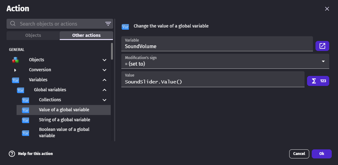 - Volume control: Use the slider value to set the volume of music or sound effects (typically 0-100)