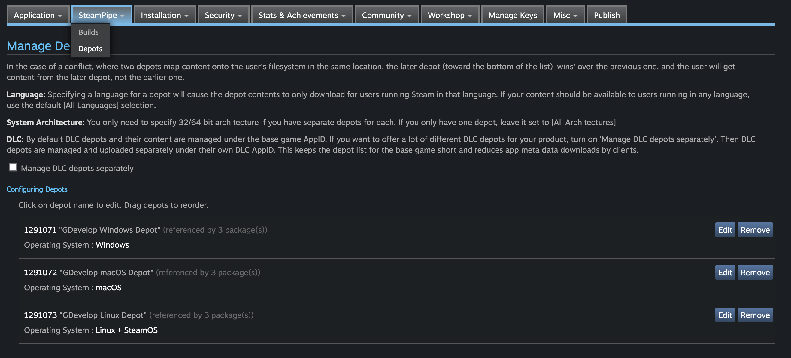 You then configure a "Build" that is using the "depots". You can use the web interface to upload the zip files for each depot: